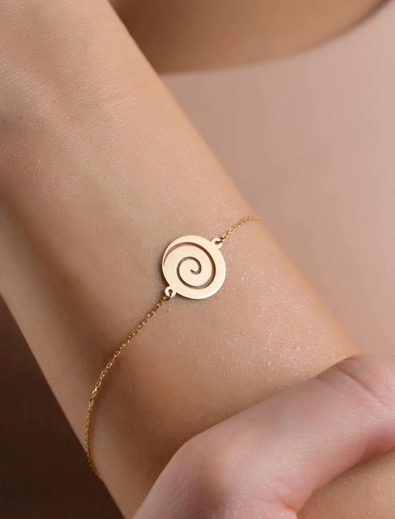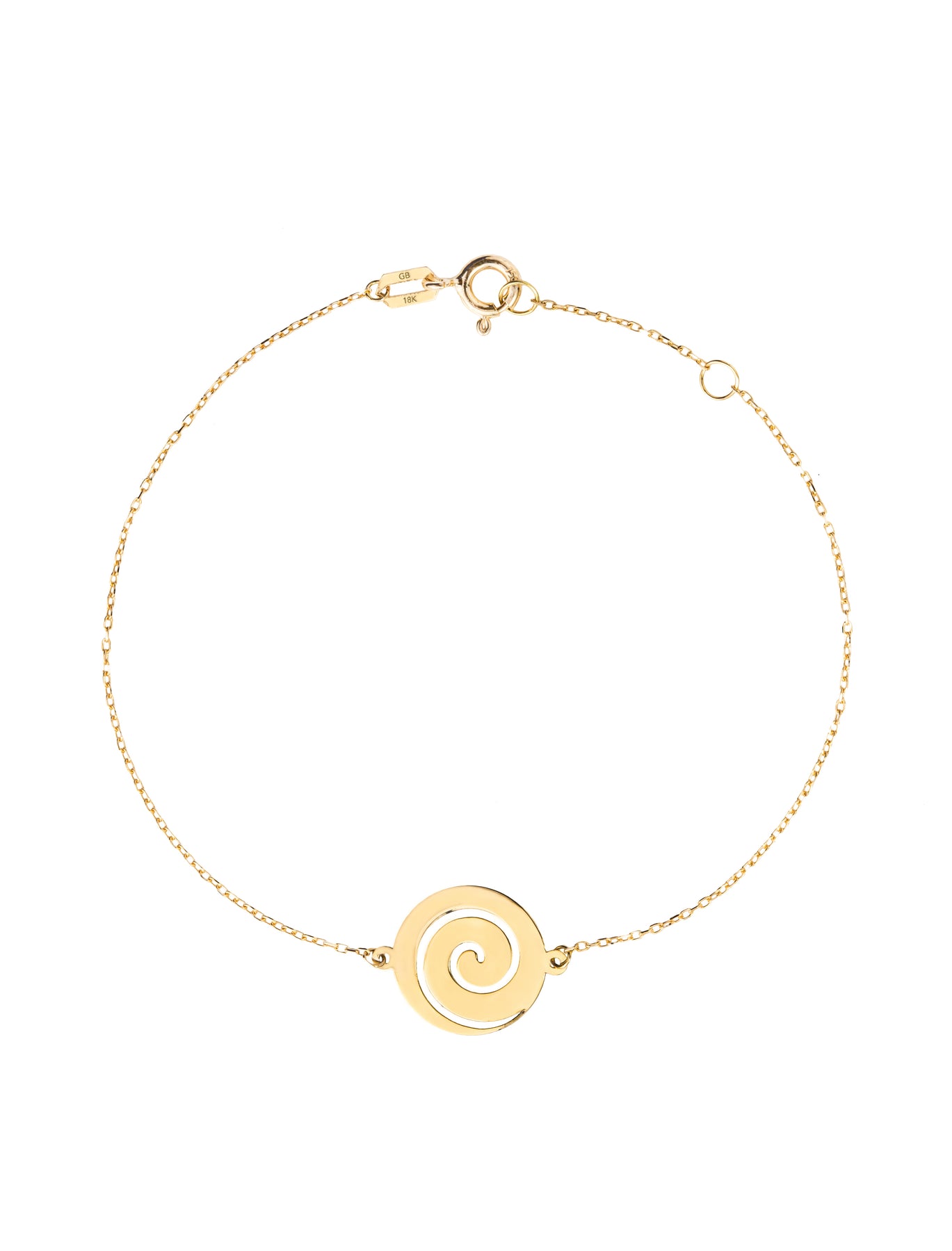 This 18k gold bracelet features a spiral motif on a dainty chain. It is an incredible addition to your everyday looks and a perfect stacking piece. (Size: 18 cm, adjustable to 16.5 cm)